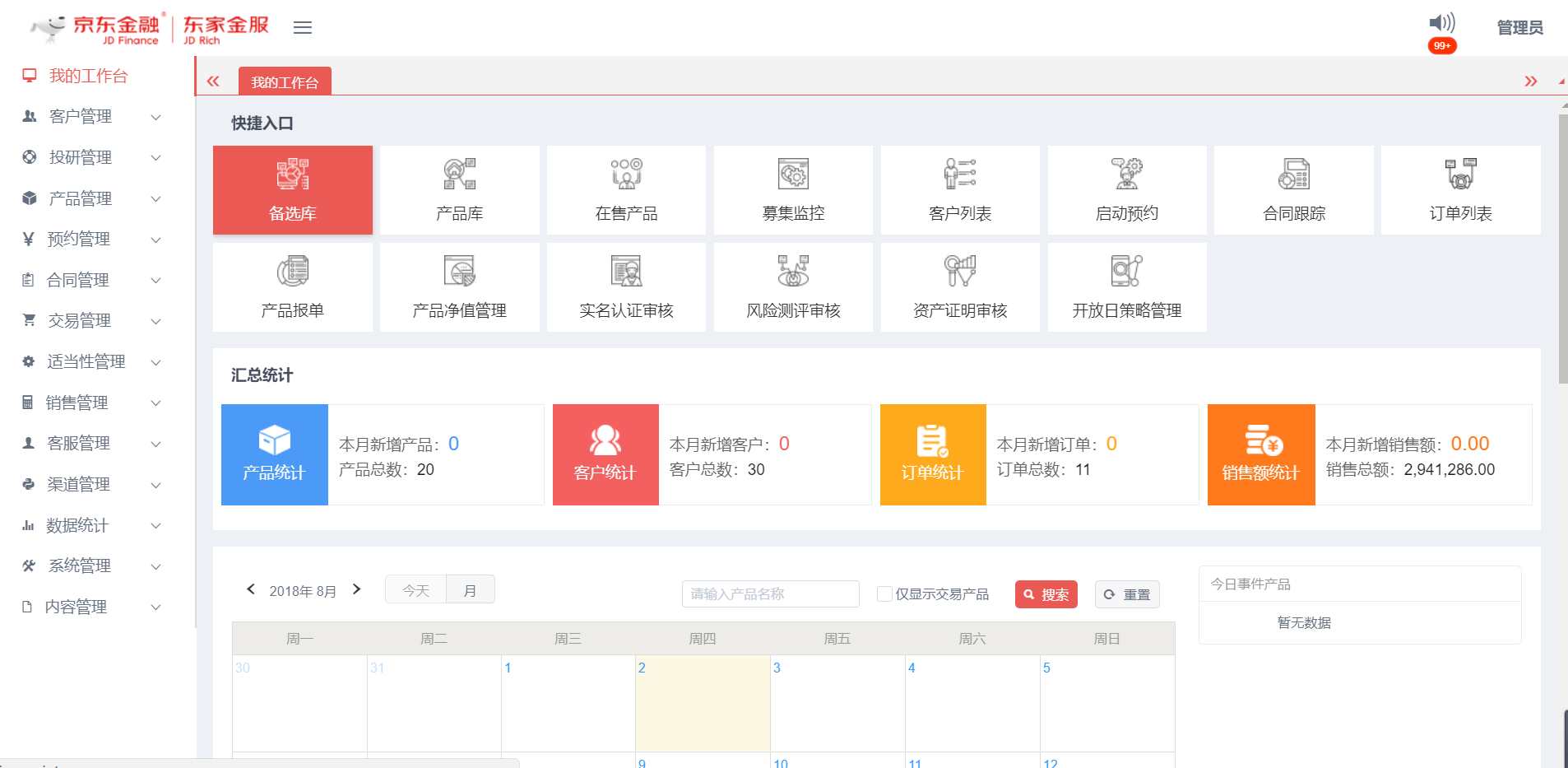 • 我的工作臺(tái):提供系統(tǒng)菜單快捷入口,統(tǒng)計(jì)核心業(yè)務(wù)數(shù)據(jù)及開放期內(nèi)的產(chǎn)品日歷事件展示